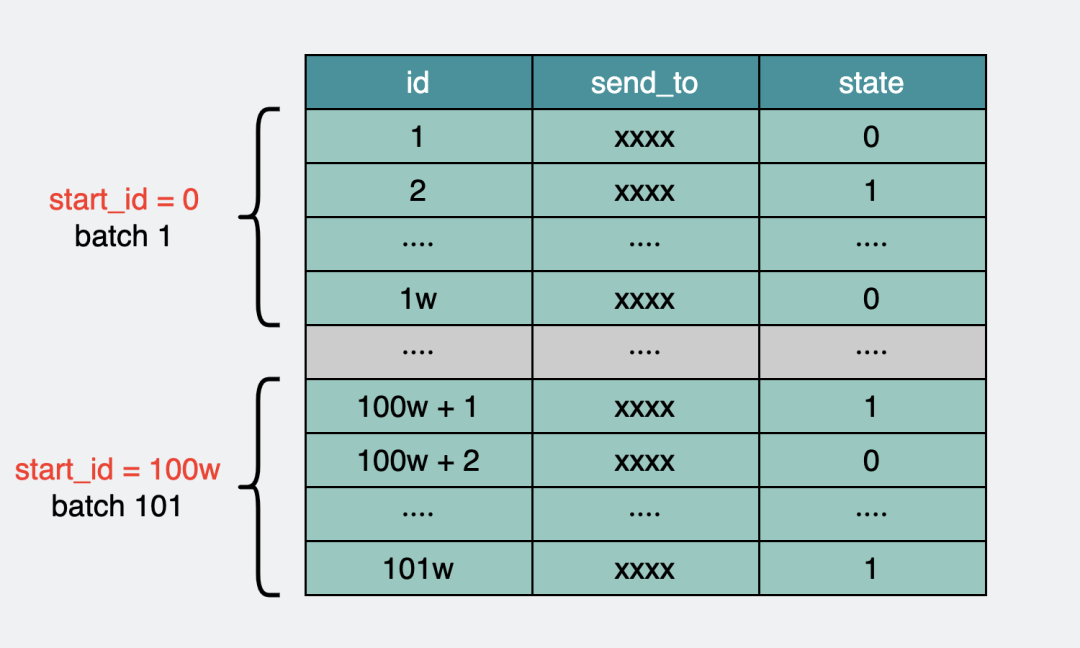 举个例子,比如上面的短信表,可以按id排序,每次取出1w条数据,记下这一批里最大的id,然后下次从最大id开始再拿1w条数据出来,不断循环。